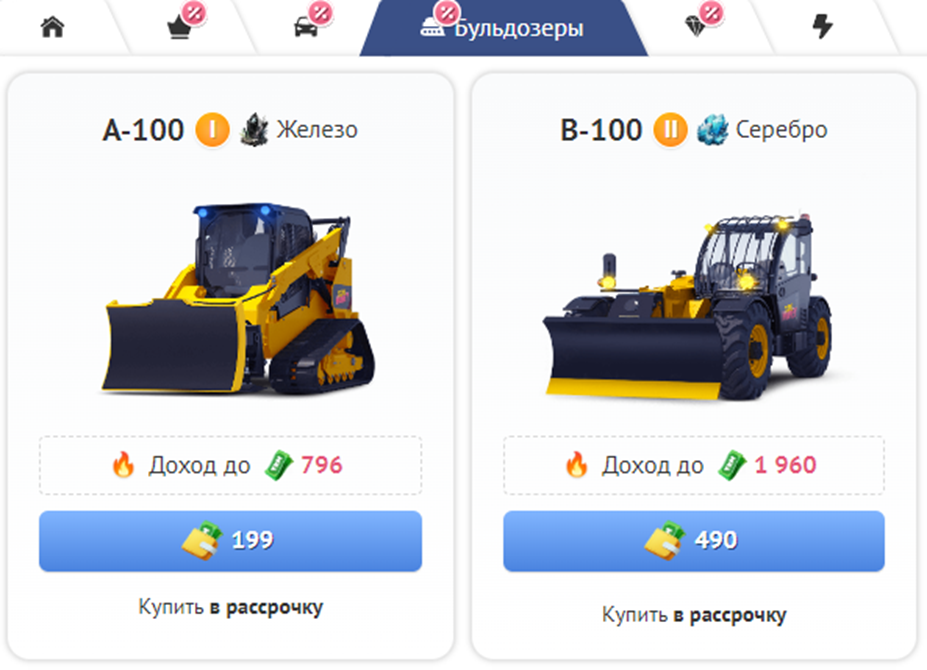 Чтобы купить бульдозер, откройте страницу «Купить бульдозер». В игре существует 5 уровней моделей бульдозеров. Чем выше уровень модели бульдозера, тем более ценную руду он может добывать: A-100 (1 уровень) — железо, B-100 (2 уровень) — серебро, C-100 (3 уровень) — платина, S-100 (4 уровень) — золото, T-100 (5 уровень) — палладий.
